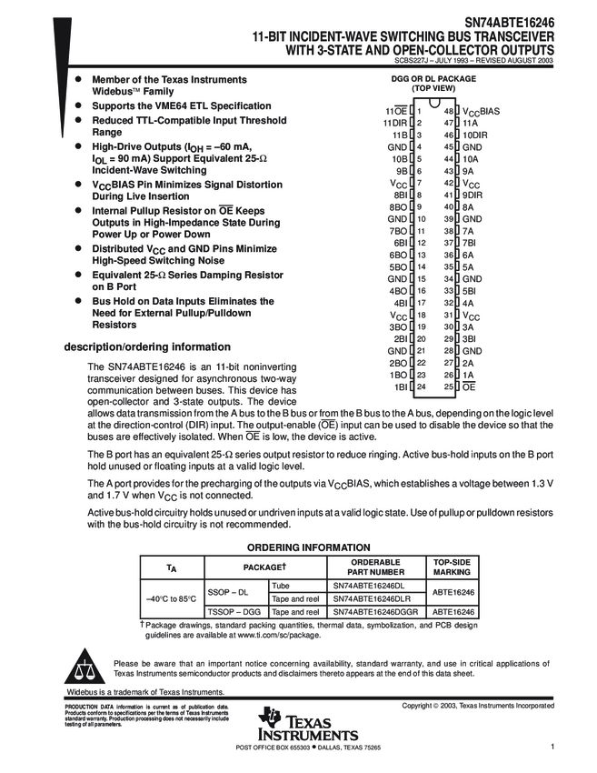 SN74ABTE16246DLR Bus XCVR Single 11-CH 3-ST/Open Collector 48-Pin SSOP T/R