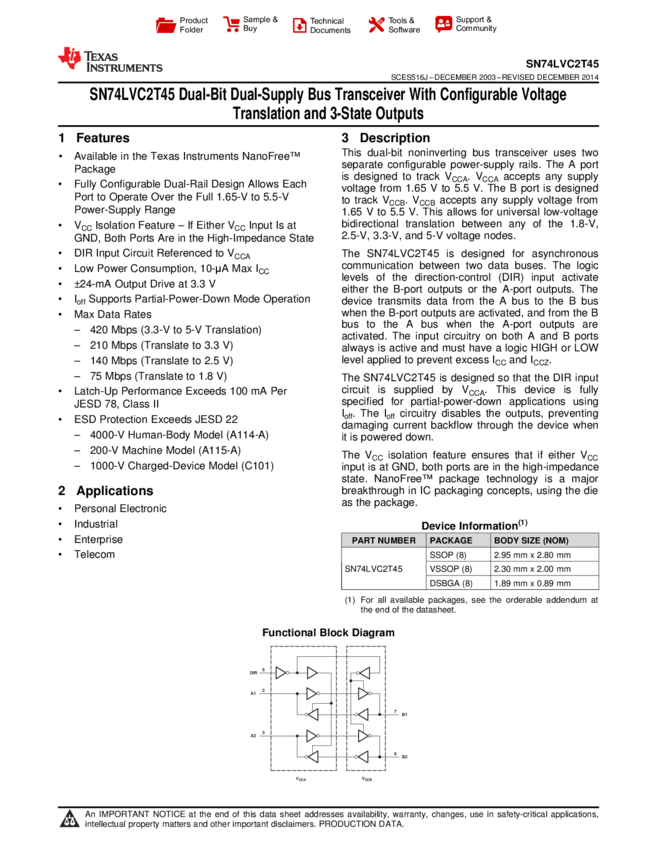 SN74LVC2T45YZPR Bus XCVR Single 2-CH 3-ST 8-Pin DSBGA T/R