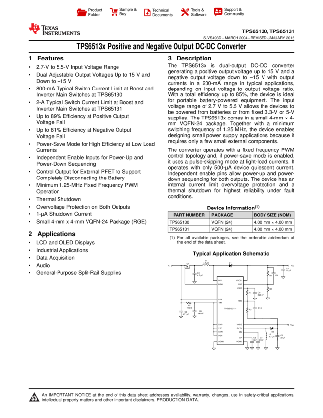 TPS65131RGER Conv DC-DC Dual Inv/Step Up 2.7V to 5.5V 24-Pin VQFN EP T/R