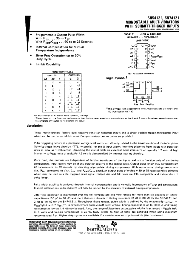 SN54121J Monostable Multivibrator Single 14-Pin CDIP Tube