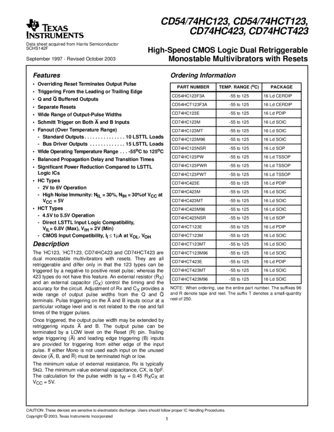 CD74HC423E Monostable Multivibrator Dual 16-Pin CDIP Tube