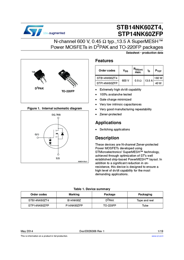 STB14NK60ZT4 Trans MOSFET N-CH 600V 13.5A 3-Pin(2+Tab) D2PAK T/R