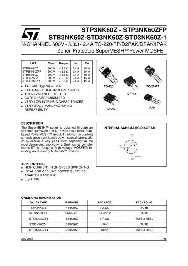 STD3NK60ZT4 Trans MOSFET N-CH 600V 2.4A 3-Pin(2+Tab) DPAK T/R