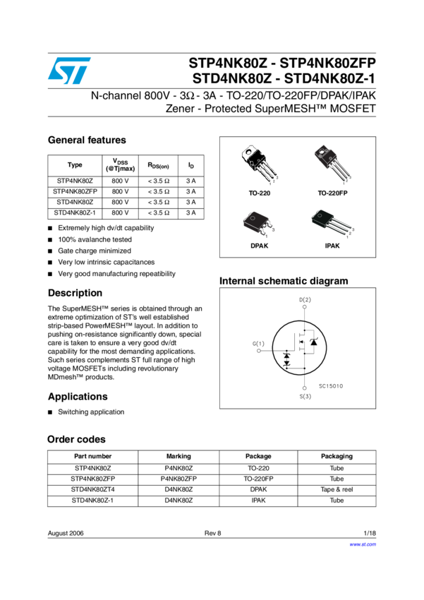 STD4NK80ZT4 Trans MOSFET N-CH 800V 3A 3-Pin(2+Tab) DPAK T/R