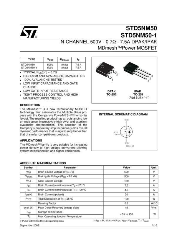 STD5NM50T4 Trans MOSFET N-CH 500V 7.5A 3-Pin(2+Tab) DPAK T/R