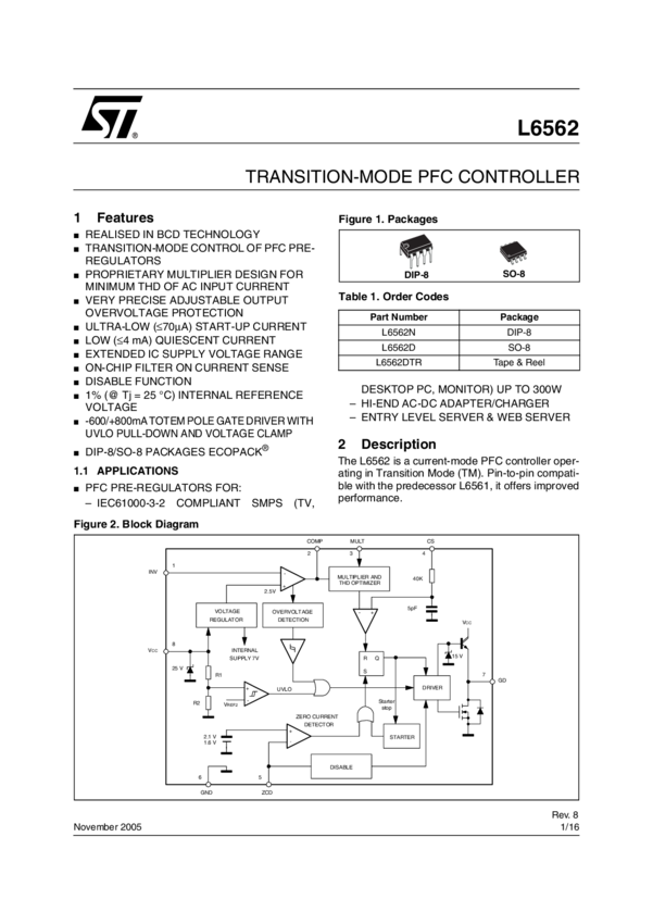 L6562DTR Power Factor Correction CONTRLR 0.04mA 8-Pin SO N T/R