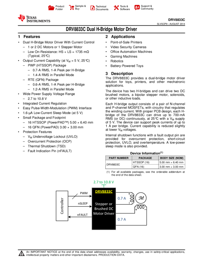 DRV8833CRTET Dual H-Bridge Motor Driver 2.7V to 10.8V 16-Pin WQFN T/R