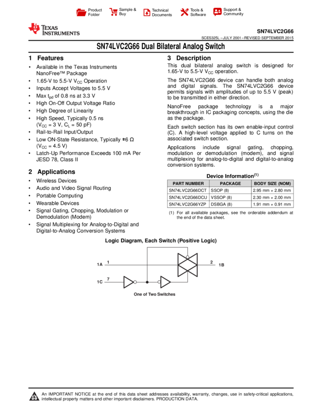 SN74LVC2G66DCUT Analog Switch Dual SPST 8-Pin VSSOP T/R
