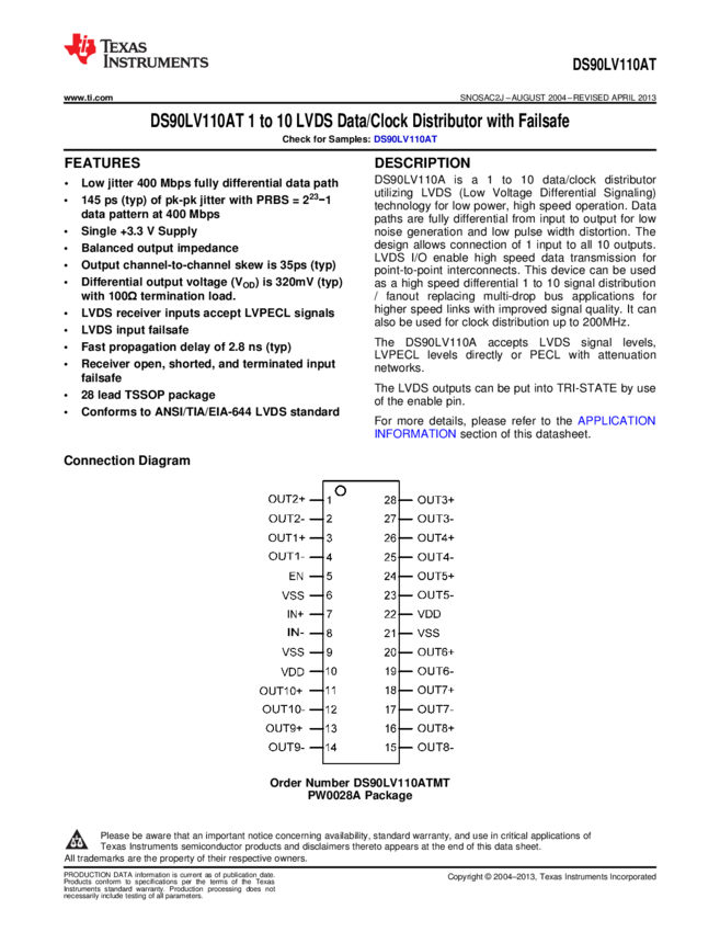 DS90LV110ATMTX/NOPB LVDS Repeater 0.45V 28-Pin TSSOP T/R