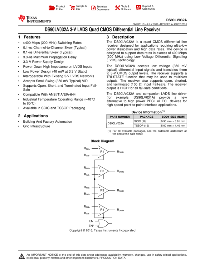 DS90LV032ATMTC/NOPB LVDS Receiver 16-Pin TSSOP Rail