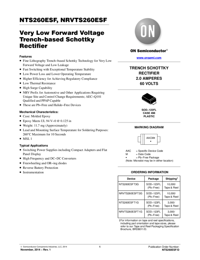 NRVTS260ESFT1G Diode Schottky 60V 2A 2-Pin SOD-123FL T/R