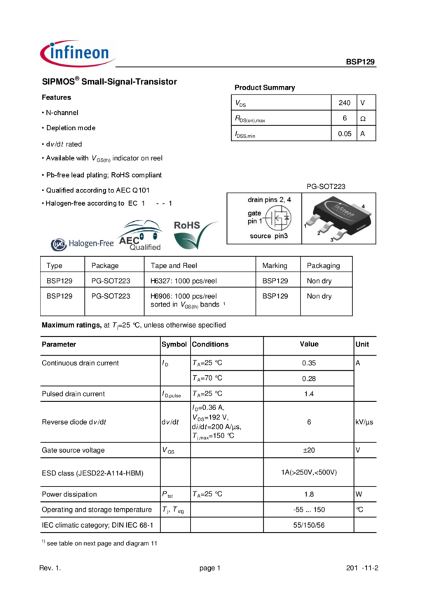 BSP129H6327XTSA1 Trans MOSFET N-CH 240V 0.35A 4-Pin SOT-223 T/R