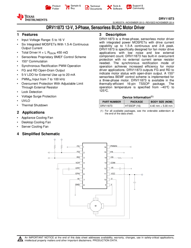 DRV11873PWPR Sensorless Motor Driver 5V to 16V 16-Pin HTSSOP T/R