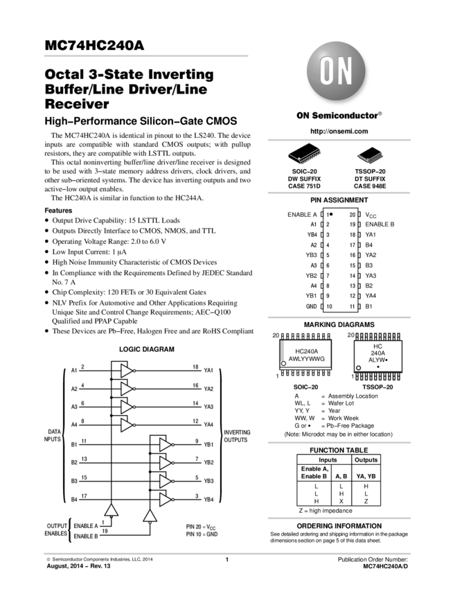 MC74HC240ADTR2G Buffer/Line Driver 8-CH Inverting 3-ST CMOS 20-Pin TSSOP T/R