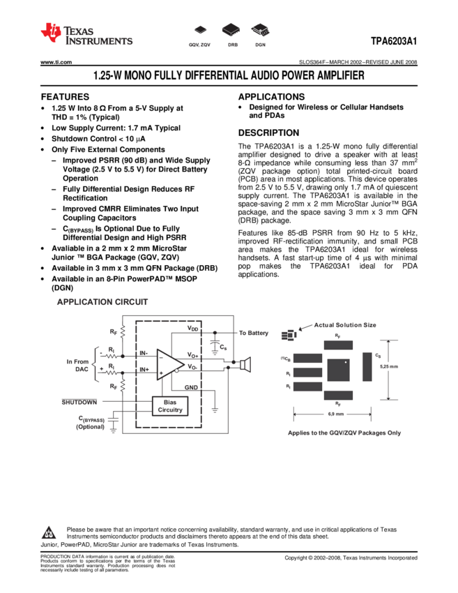 TPA6203A1DGNR Audio Amp Speaker 1-CH Mono 1.25W Class-AB 8-Pin HTSSOP EP T/R