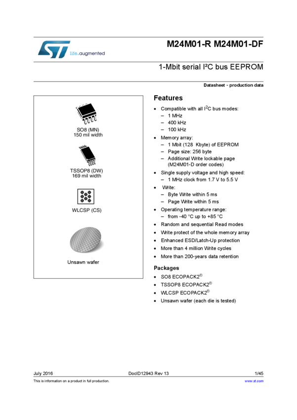 M24M01-RMN6TP EEPROM Serial-I2C 1M-bit 128K x 8 2.5V/3.3V/5V 8-Pin SO N T/R