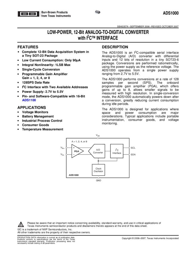 ADS1000A1IDBVT ADC Single Delta-Sigma 128sps 12-bit Serial 6-Pin SOT-23 T/R