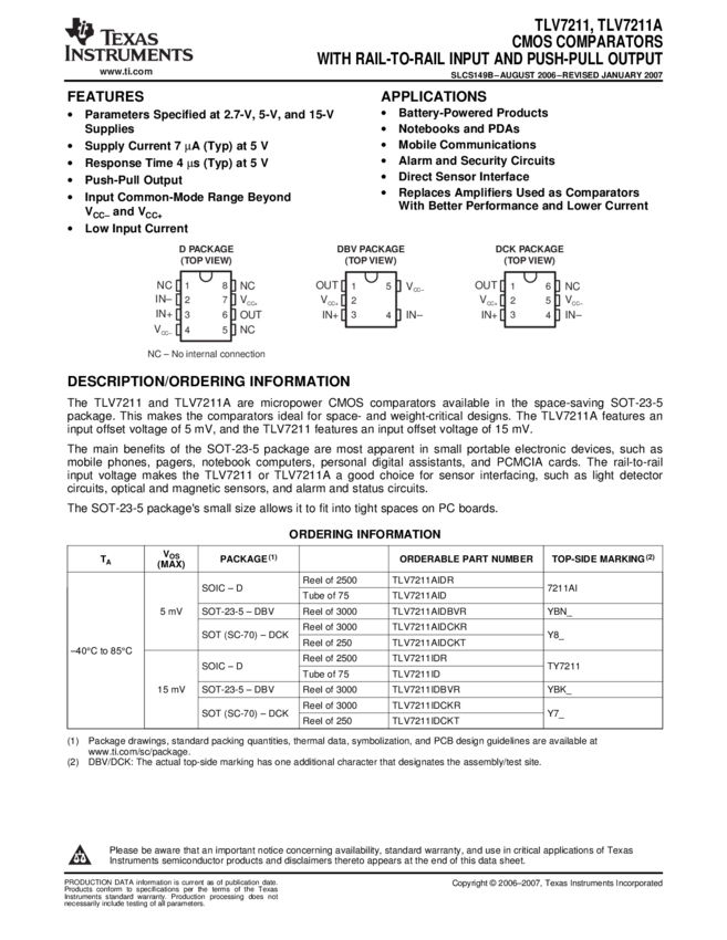 TLV7211AIDBVR Comparator Single R-R I/P 15V 5-Pin SOT-23 T/R
