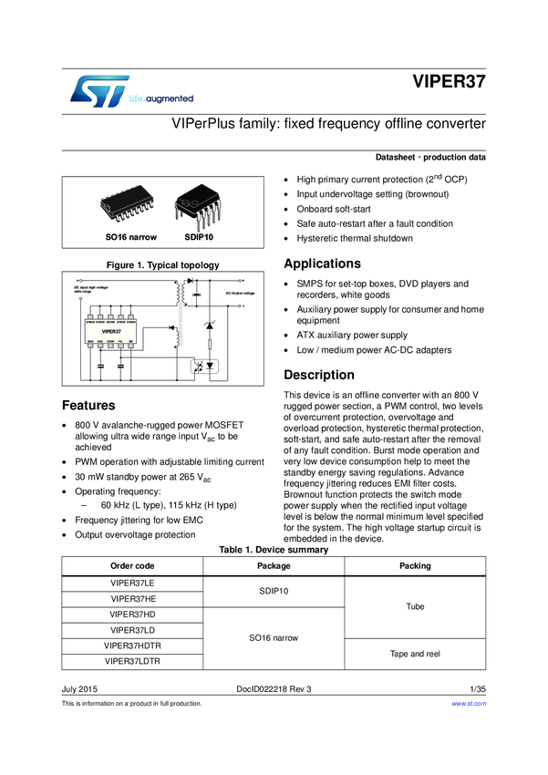 VIPER37LDTR Current Mode PWM Controller 16-Pin SOIC T/R