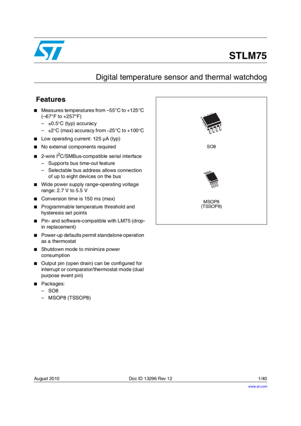 STLM75DS2F Temp Sensor Digital Serial (2-Wire, I2C) 8-Pin MSOP T/R