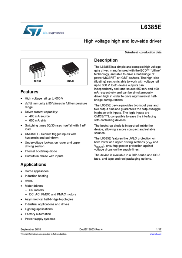 L6385ED013TR MOSFET DRVR 600V 0.65A 2-OUT Hi/Lo Side Half Brdg Non-Inv 8-Pin SO N T/R
