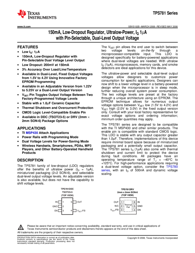 TPS78101DDCR LDO Regulator Pos 1.22V to 5.25V 0.15A 5-Pin SOT T/R