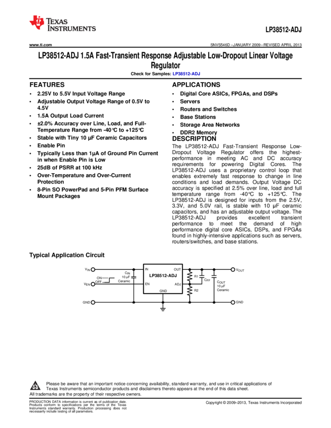 LP38512TJ-ADJ/NOPB LDO Regulator Pos 0.5V to 4.5V 1.5A 5-Pin Thin TO-263 EP T/R