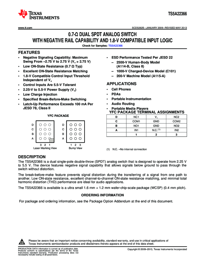 TS5A22366YFCR Analog Switch Dual SPDT 12-Pin DS-BGA T/R