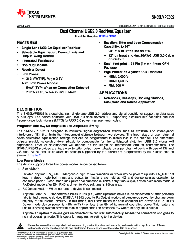 SN65LVPE502RGET Dual Channel USB3.0 Redriver/Equalizer 24-Pin VQFN EP T/R