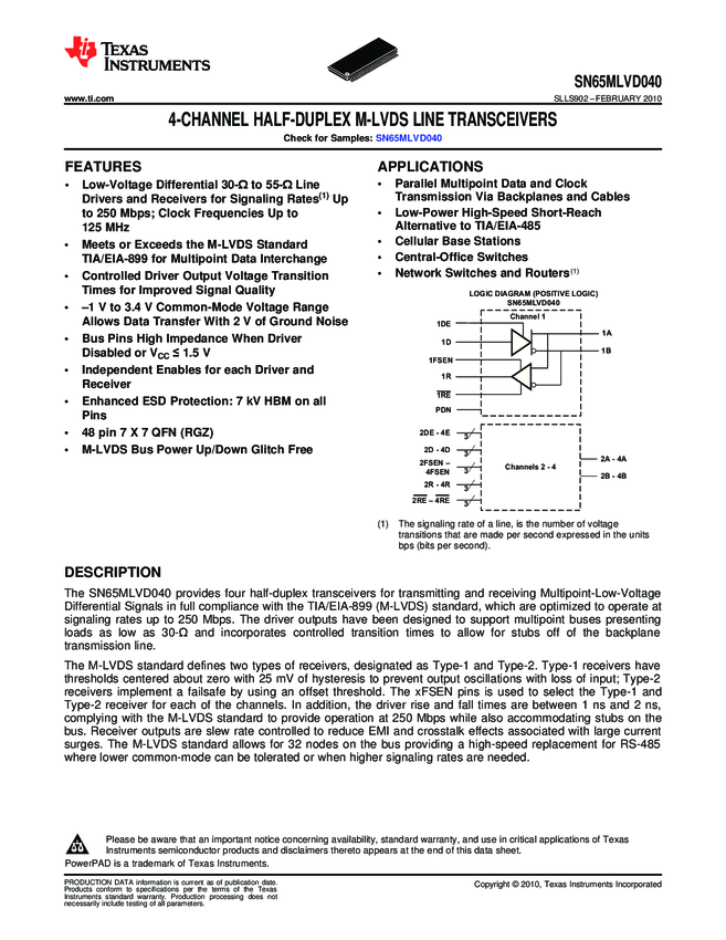4-Channel Half-Duplex M-Lvds Line Transceivers 48-Pin VQFN EP T/R