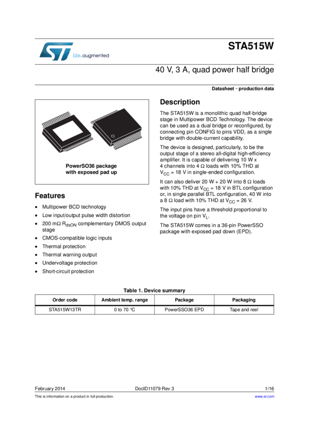 STA515W13TR Quad Power Half Bridge 36-Pin PowerSSO EP T/R