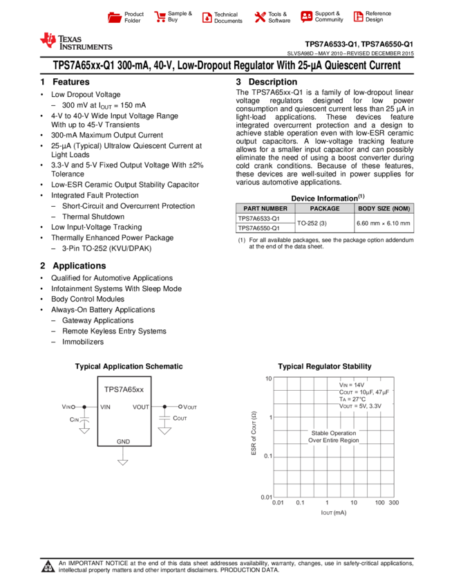 TPS7A6533QKVURQ1 LDO Regulator Pos 3.3V 0.3A 3-Pin(2+Tab) TO-252 T/R