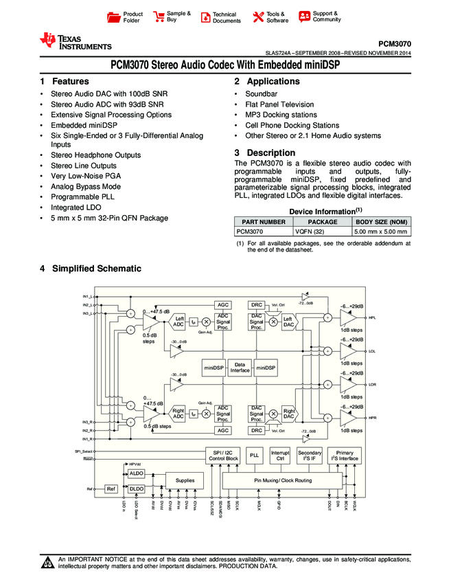 PCM3070IRHBT Audio Codec 2ADC / 2DAC 32-Pin VQFN EP T/R