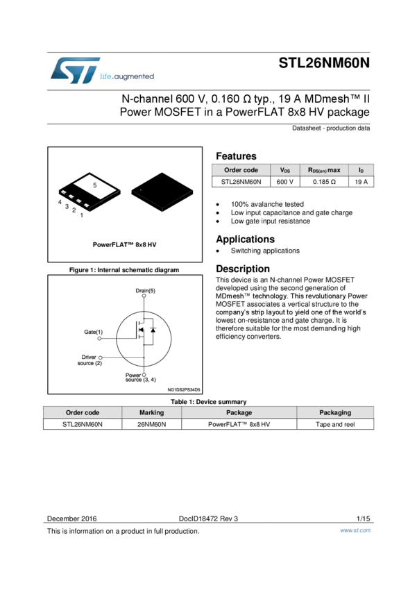 STL26NM60N Trans MOSFET N-CH 600V 19A 4-Pin Power Flat T/R