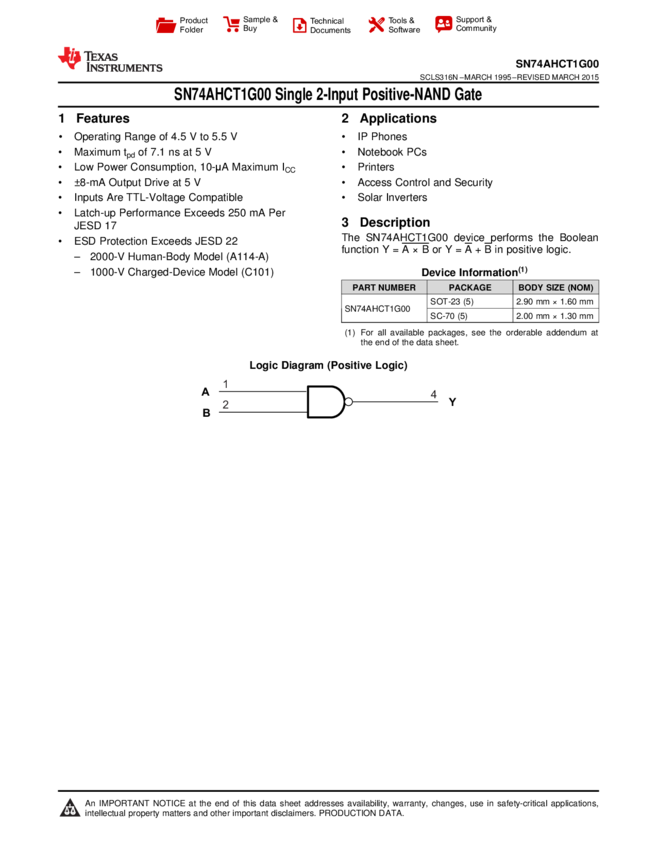SN74AHCT1G00DBVR NAND Gate 1-Element 2-IN CMOS 5-Pin SOT-23 T/R