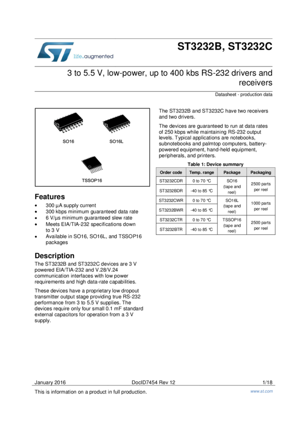 ST3232CTR Dual Transmitter/Receiver RS-232 16-Pin TSSOP T/R