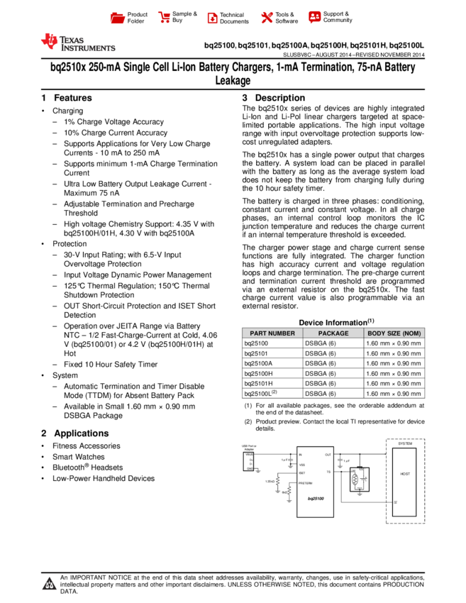BQ25100YFPT Battery Charger Li-Ion 250mA 6-Pin DSBGA T/R