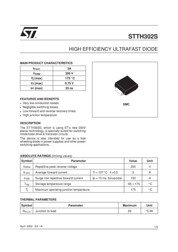 STTH302S Diode Switching 200V 3A 2-Pin SMC T/R