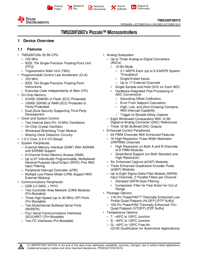 TMX320F28075PZPT MCU 32-Bit Piccolo F2807x C28x RISC 512KB Flash 1.2V/3.3V 100 -Pin HTQFP EP