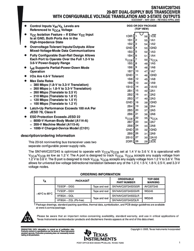 SN74AVC20T245ZQLR Bus XCVR Dual 20-CH 3-ST 56-Pin BGA MICROSTAR JUNIOR T/R