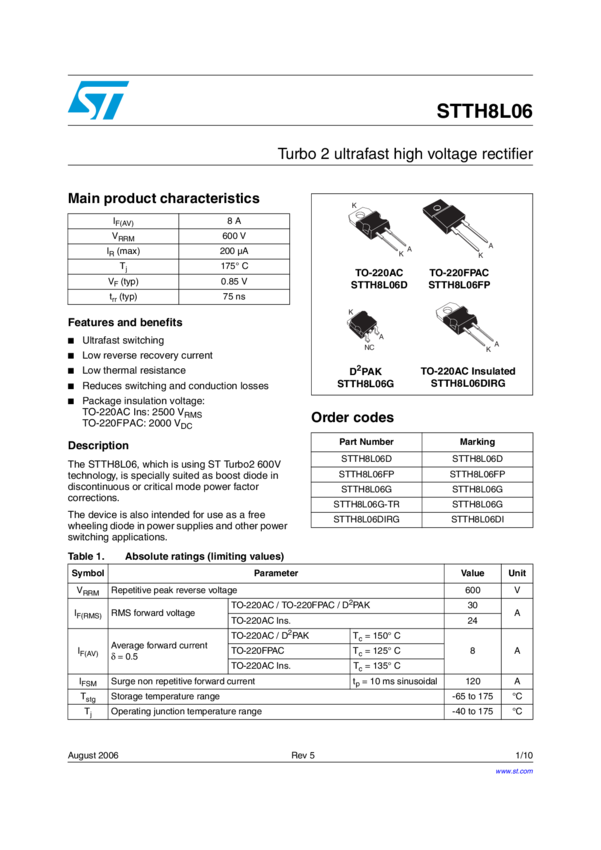STTH8L06G-TR Diode Switching 600V 8A 3-Pin(2+Tab) D2PAK T/R