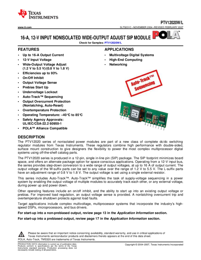 PTV12020WAD Module DC-DC 1-OUT 1.2V to 5.5V 16A 12-Pin SIP Module