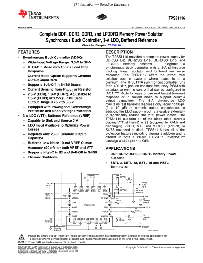 TPS51116RGET DC DC Cntrlr Single-OUT Sync Buck 3V to 28V Input 24-Pin VQFN EP T/R