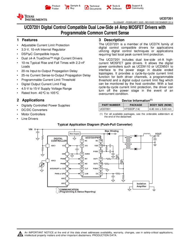 UCD7201PWPR MOSFET DRVR 4A 2-OUT Lo Side Half Brdg Non-Inv 14-Pin HTSSOP EP T/R