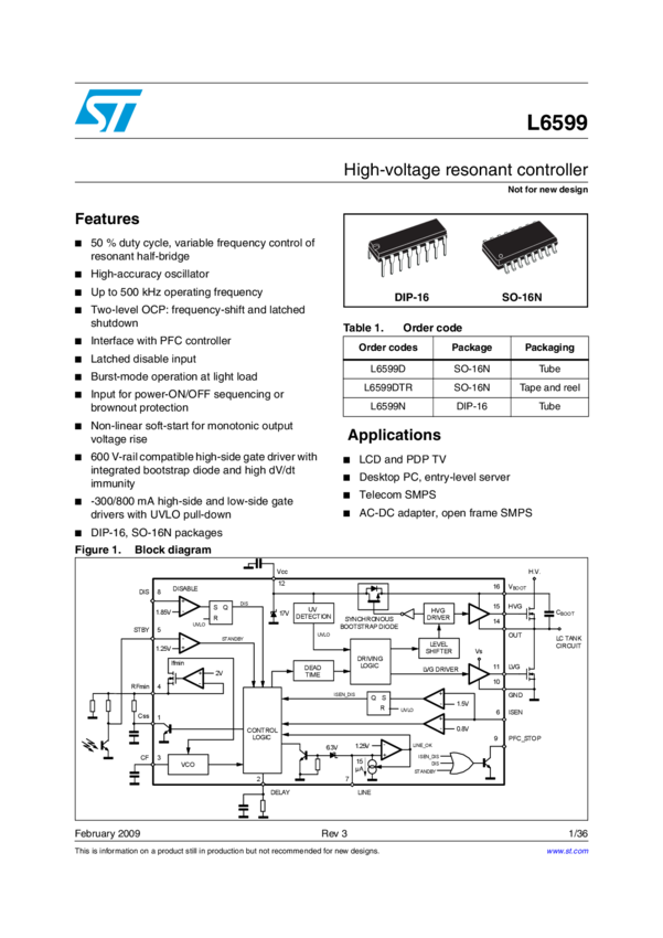 L6599DTR Soft Sw PWM Cntrlr 1-OUT PH SHIFT RES 500KHz 16-Pin SO N T/R