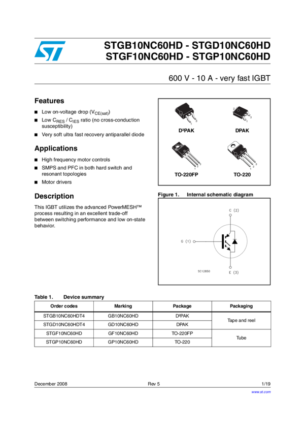 STGB10NC60HDT4 Trans IGBT Chip N-CH 600V 20A 3-Pin(2+Tab) D2PAK T/R