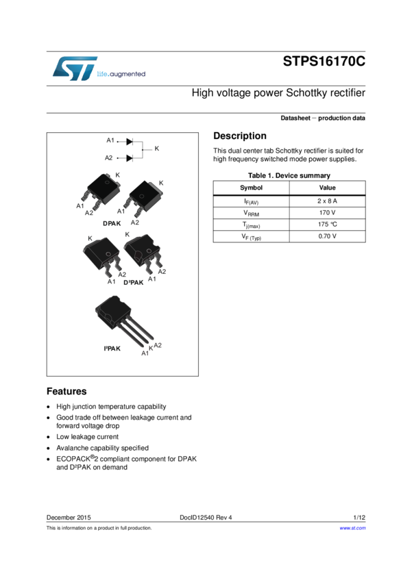 STPS16170CB-TR Diode Schottky 170V 16A 3-Pin(2+Tab) DPAK T/R