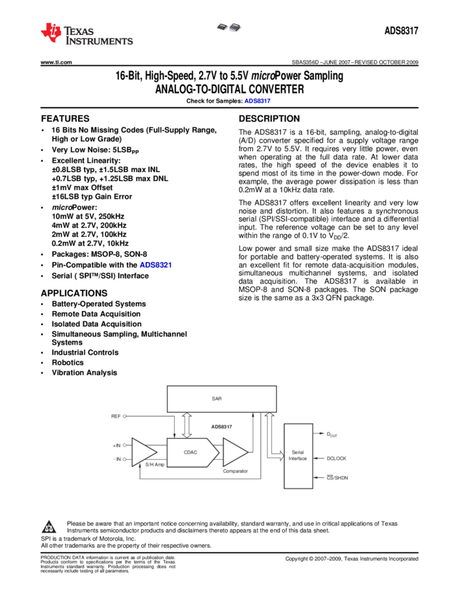 ADS8317IDGKT ADC Single SAR 250ksps 16-bit Serial 8-Pin VSSOP T/R
