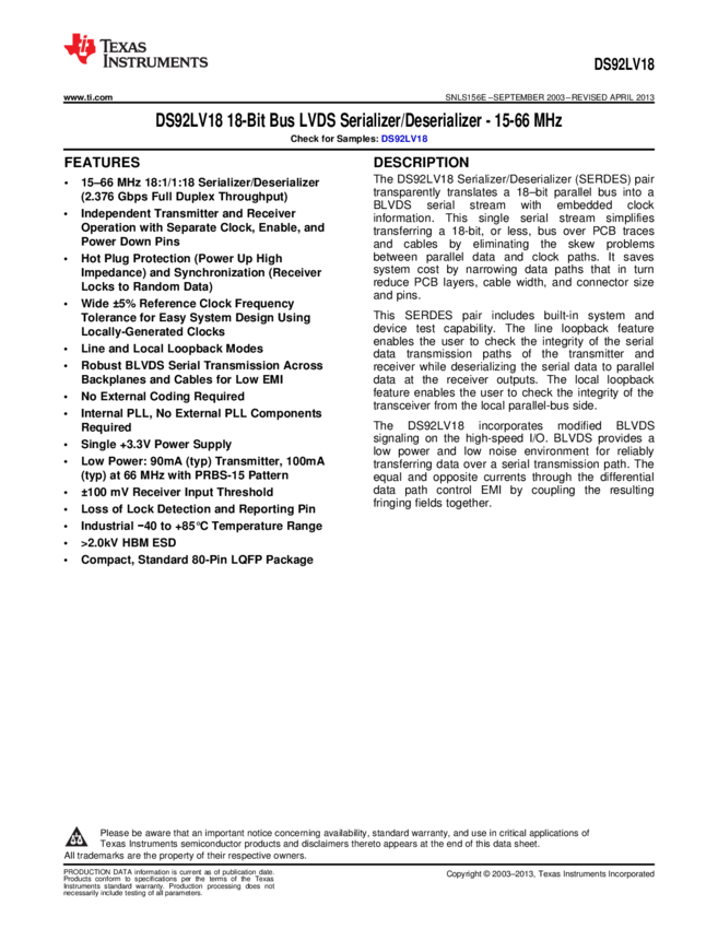 DS92LV18TVVX/NOPB LVDS Serdes 0.55V 80-Pin LQFP T/R