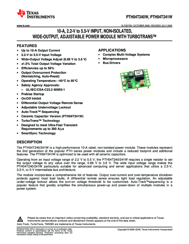 PTH04T240WAZT Module DC-DC 1-OUT 0.69V to 3.6V 10A 11-Pin DIP Module T/R